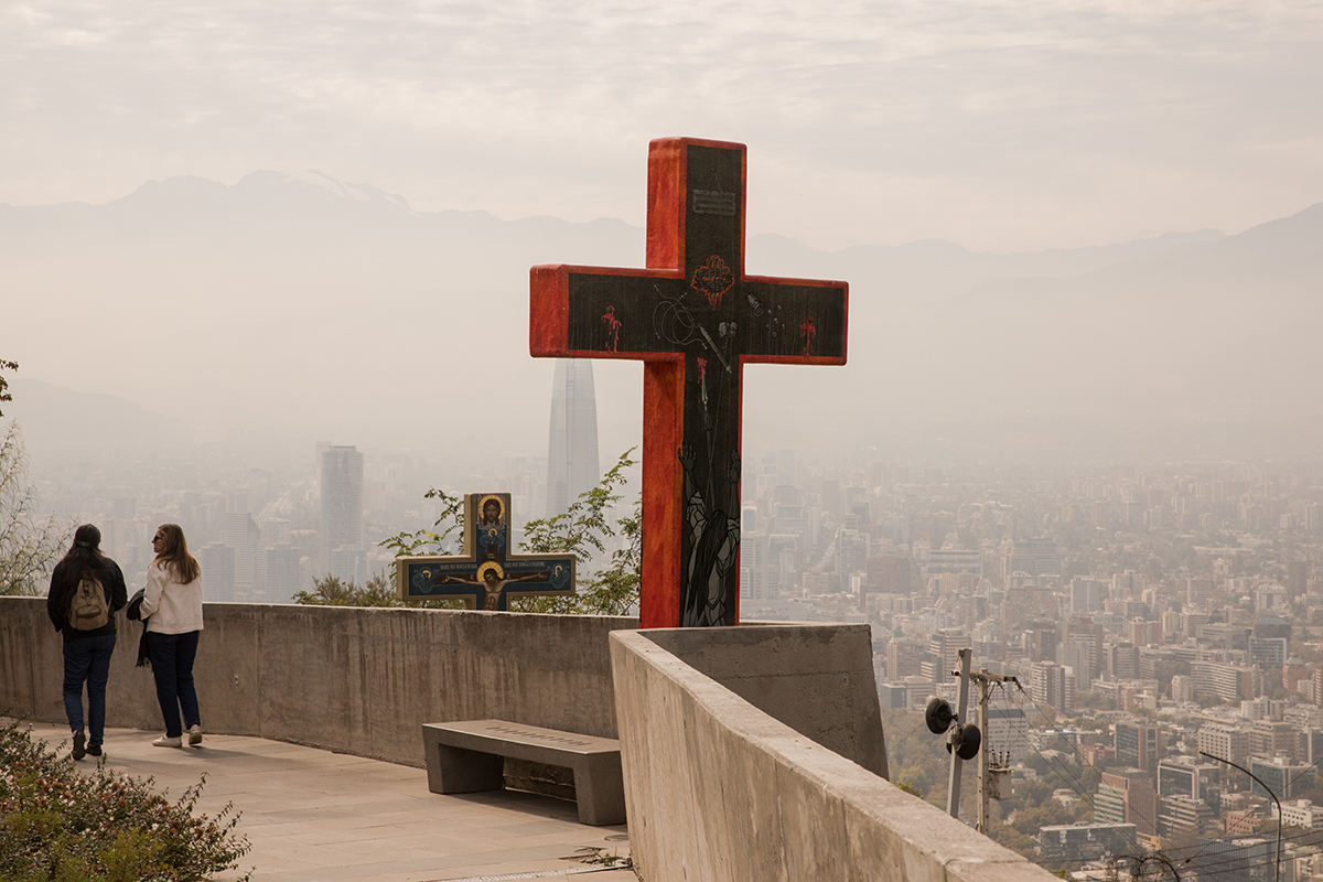 On accède au sommet du cerro San Cristobal – qui culmine à 865 mètres d’altitude – en téléphérique, voire à pied ou à vélo pour les plus courageux. Du haut de la colline, la vue sur la ville, immense en contrebas, est magnifique. Tout comme le panorama sur l’imposante cordillère des Andes qui semble protéger la ville et fait planer une ombre bienveillante sur les quartiers chics à l’est. On profite du coucher de soleil et des lumières qui scintillent à perte de vue.