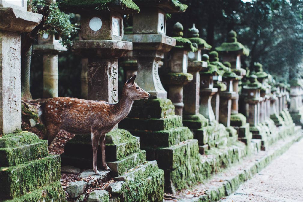 Nara est restée fidèle à ce qu’elle était et rend un beau compte de sa domination perdue. La visite est très évocatrice d’un Japon éternel, où les cerfs sika sont sacrés et libres de circuler en ville parce que l’un d’entre eux a, un jour, été le véhicule ailé du dieu-tonnerre Takemikazuchi. Les sept temples fameux sont Daian-ji, Gango-ji, Horyu-ji, Kofuku-ji, Saidai-ji, Yakushi-ji et Todai-ji. On peut à bon droit leur adjoindre le Toshodai-ji, même si sa fondation est un peu postérieure et le fait d’un moine d’outremer. L’ancien palais impérial, une cité administrative et résidentielle sur le modèle chinois, située selon ce même modèle dans la partie centre-nord de la ville, finit par servir de ferme, puis s’évanouir. Au XXe siècle, des fouilles en mettent à jour les fondements (et une reconstruction est engagée sur documents d’époque). Les vestiges sont classés par l’Unesco, qui réinstalle donc face à face l’empereur et les moines.