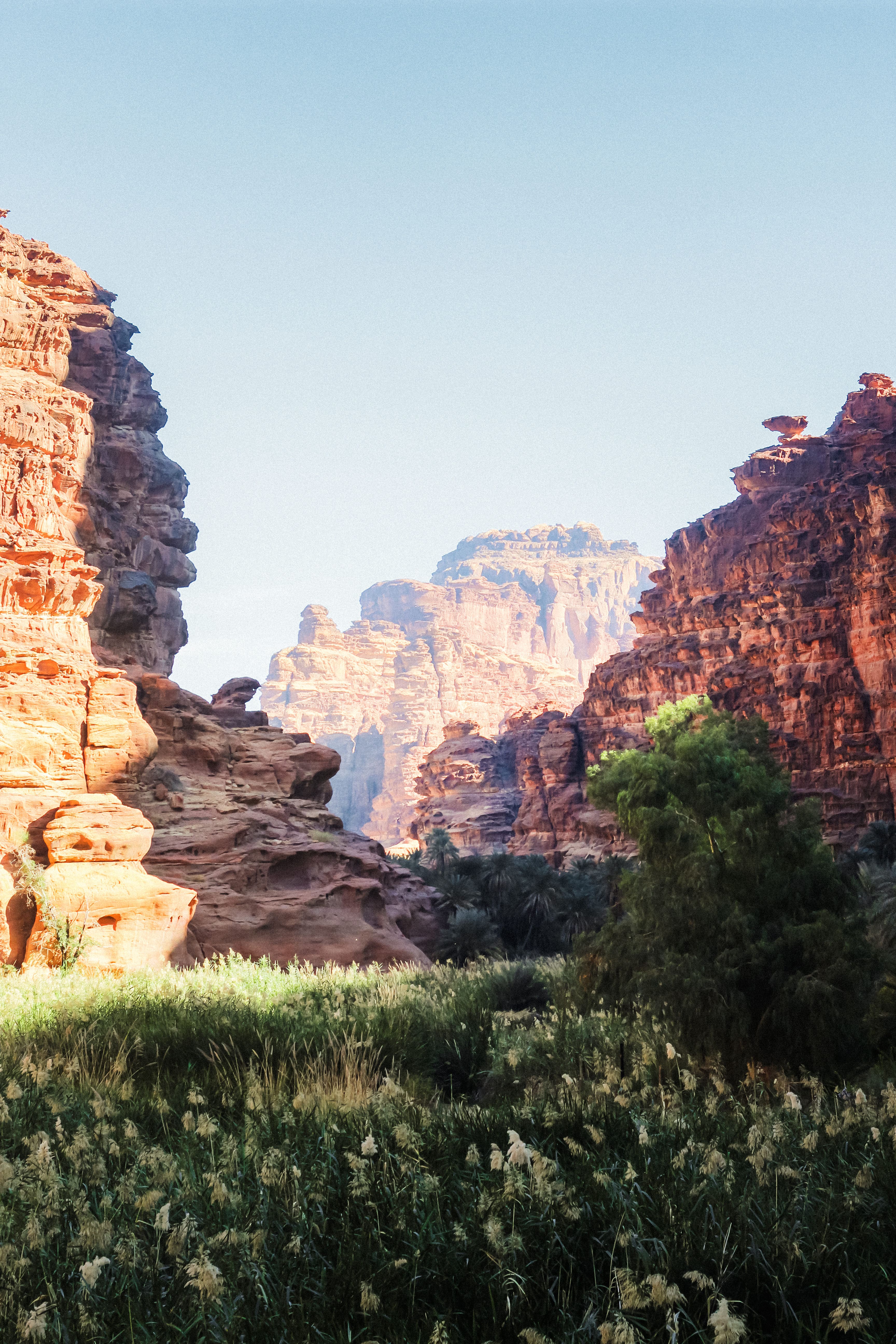 Dans la région de Tabuk, Wadi Disah apparaît comme une fresque végétale surgie de nulle part. Des falaises de grès rouge s’élèvent en orgues monumentales tandis qu’au fond serpente un ruban de palmiers et de prairies humides. L’air y est plus doux, chargé d’une fraîcheur inattendue. On marche dans l’eau peu profonde, chaussures à la main, le regard levé vers les parois sculptées. En avançant lentement dans le lit du wadi, le paysage se dévoile par couches successives : grottes, replis d’ombre, éclats de lumière sur la roche. Les guides évoquent les crues soudaines, les printemps discrets, la patience des tribus qui ont appris à lire le ciel. On partage parfois quelques dattes fraîches et un café arabe infusé à la cardamome à l’ombre d’un palmier, geste simple qui dit l’hospitalité du désert. Disah n’est pas seulement spectaculaire, il est hospitalier, presque méditerranéen dans sa générosité végétale, comme si le désert avait décidé, ici, d’être magnanime.