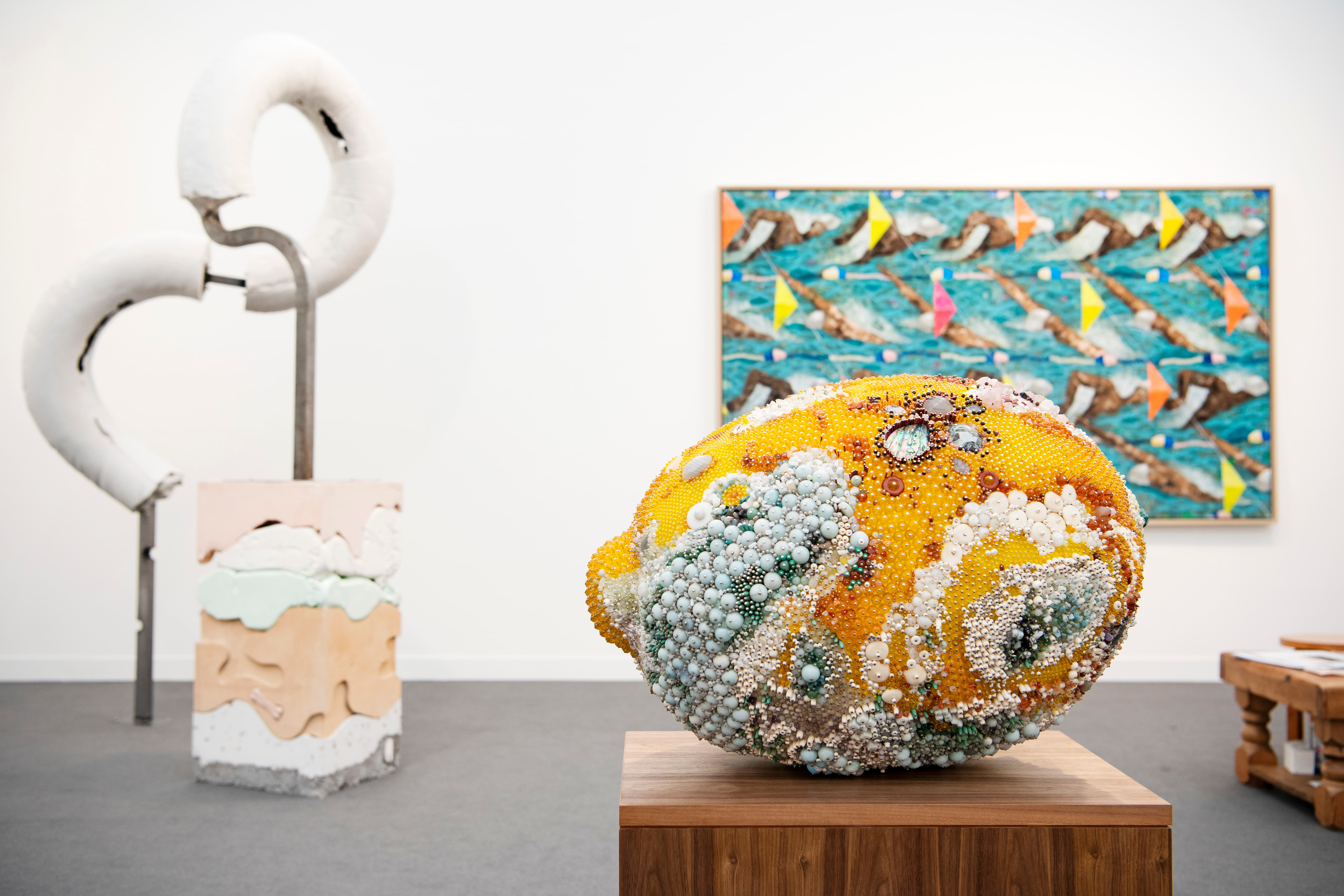 Peut-être est-ce pour contrer la légendaire grisaille londonienne que, sur les murs éphémères des galeries Perrotin, Gagosian, Zwirner ou White Cube, les œuvres colorées et vitaminées s’enchaînent. L’art se met sur le fuseau horaire londonien et s’accorde avec les tenues extravagantes des British. On s’amuse à instagramer les instagrameurs qui s’instagrament devant les toiles. Une mise en abyme bigarrée qui laisse songeurs… Jusqu’où va la catharsis si l’on regarde seulement une toile à travers le prisme de sa “story” ? A-t-on le temps d’interpréter, d’analyser, de comprendre, quand on se précipite pour poster un cliché carré ? La foule qui se presse devant les citrons étincelants et piqués de pierres précieuses de Kathleen Ryan aperçoit-elle seulement la pourriture manger le fruit (voir p.22) ? Combien de temps durera, et jusqu’où ira, ce marché de l’art qui vend une banane scotchée à un mur pour 120 000 dollars (l’œuvre de Maurizio Cattelan, décembre 2019, à la foire Art Basel de Miami) ? Mais peut-être faut-il un tel chaos, une telle foire, pour bousculer les jeunes talents et leur donner l’envie de migrer vers d’autres quartiers, d’autres galeristes, d’autres engagements plus tangibles…