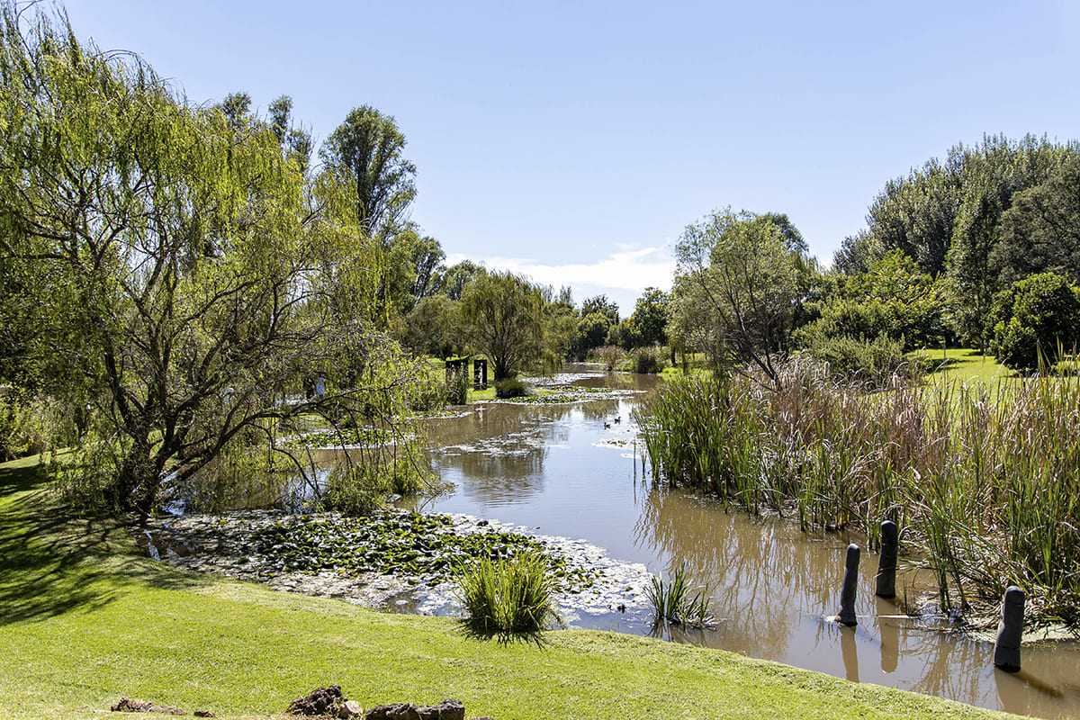 Le Dylan Lewis Sculpture Gardeen s’étend sur plusieurs hectares au pied des montagnes des Winelands. Le jardin mêle fynbos, aloès, restios, graminées et arbres méditerranéens, dessinant un paysage où les teintes évoluent naturellement, du vert profond des sous-bois au gris acier et à l’ocre des zones ouvertes. L’ensemble est structuré par des sentiers de pierre qui traversent des bosquets denses et des clairières, dévoilant des vues dégagées sur les collines environnantes. Les sculptures de Dylan Lewis, en bronze et en acier patiné, sont installées en dialogue direct avec le relief et la végétation. Leurs surfaces oxydées contrastent avec les masses végétales et se transforment selon la lumière, souvent franche et rasante. Inspirées de la faune, de figures mythologiques et de formes organiques, les œuvres s’intègrent sans artifices scénographiques, laissant au jardin un rôle central. La qualité paysagère du site structure l’expérience de visite et permet une lecture claire des œuvres dans un environnement naturel exceptionnel.