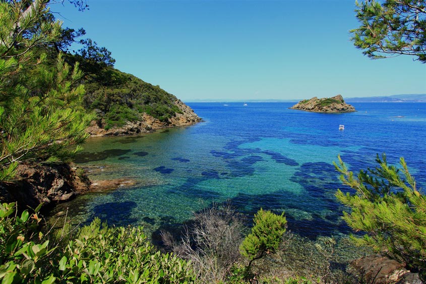 C’est le premier parc terrestre et marin en Europe, créé en 1963. Eaux turquoise et faune méditerranéenne. 140 espèces d’oiseaux – milan noir, huppes et passereaux, … : des milliers d’oiseaux migrateurs y font halte – et 180 espèces de poissons y sont répertoriés dont le grand dauphin et le mérou brun, et de nombreuses espèces protégées. Sur les îles d’Hyères, Porquerolles et Port-Cros – une poste, une épicerie, une chapelle, deux hôtels – depuis la création du parc, forêts et maquis ont repris leurs droits : belle végétation de chênes verts, de pins d’Alep et de myrtes, d’oliviers, de romarin et de bruyère. On se souvient de Jean Paulhan et des auteurs de la NRF, on visite les vestiges romains et les forts de Richelieu, on plonge à la découverte de l’épave du Donator, échoué là en 1945.