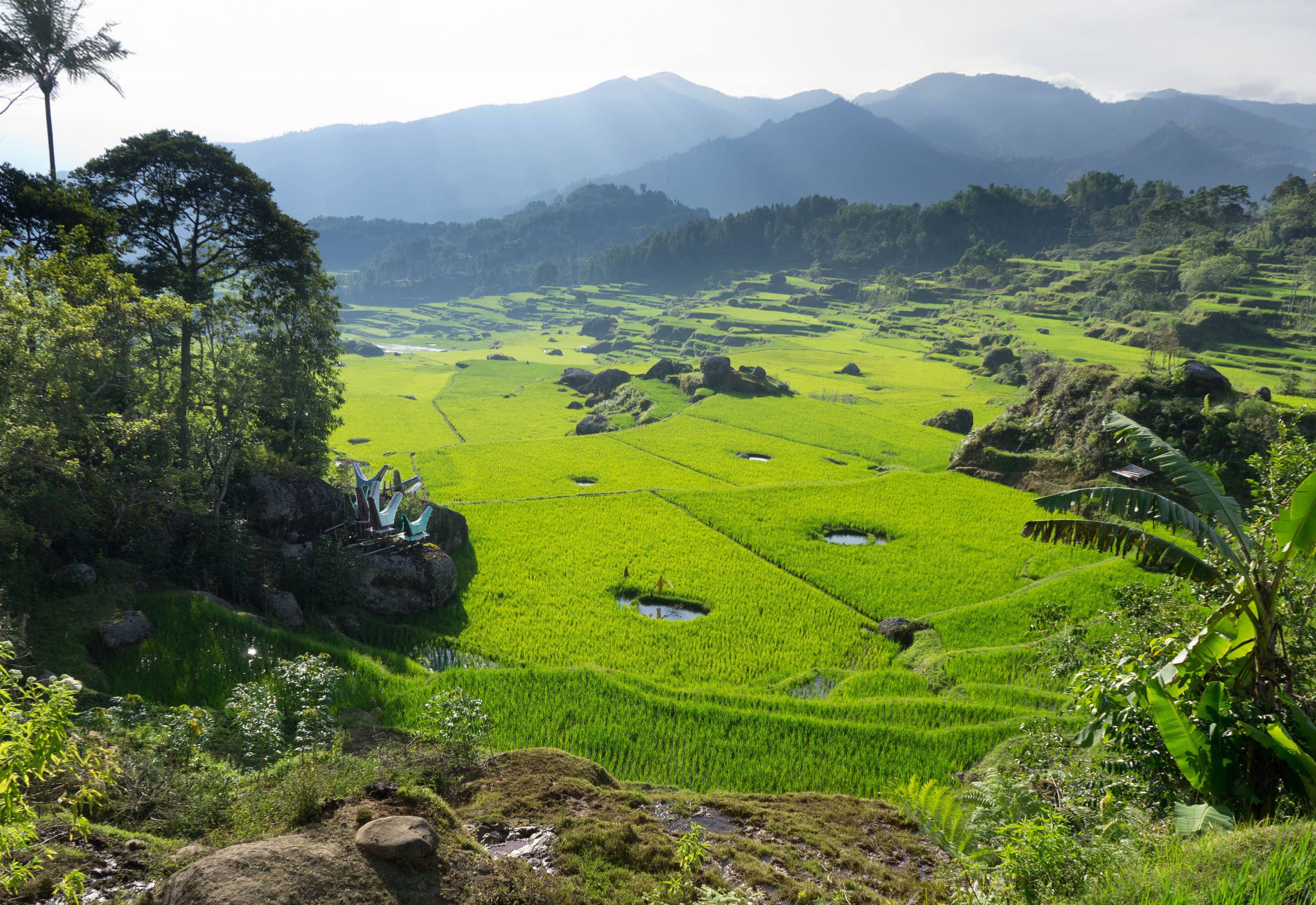 Les hautes terres de Tana Toraja invitent à la lenteur. Les rizières en terrasses dessinent des courbes d’un vert intense, irriguées par un ingénieux réseau de canaux façonné au fil des siècles. À l’aube, la brume enveloppe les vallées ; au crépuscule, la lumière dore les toits des tongkonan. Depuis Batutumonga, le panorama s’ouvre sur un amphithéâtre naturel de montagnes et de rizières. Par temps clair, les reliefs se découpent en strates successives, bleutées à l’horizon, comme un décor peint à la main. Les sentiers serpentent entre bambous, caféiers et plantations de cacao. On traverse des villages où les enfants saluent en riant, où l’on vous offre parfois un café ou un fruit cueilli sur l’arbre. Les odeurs de bois humide et de feuilles écrasées accompagnent la marche, rappelant que la montagne ici n’est jamais hostile, seulement exigeante. Le pays toraja se parcourt à pied, parfois à moto, toujours avec le sentiment d’une immersion progressive. Chaque détour révèle une maison sculptée, un grenier à riz, un cimetière suspendu. Loin des foules balnéaires, Sulawesi conserve une respiration ample, presque confidentielle.