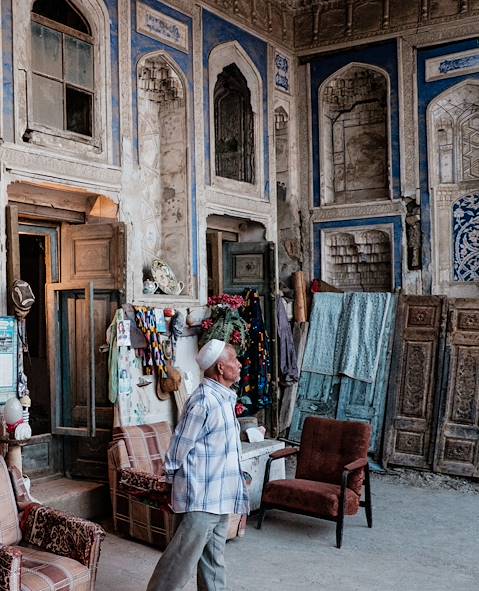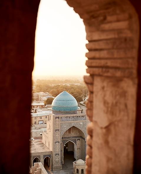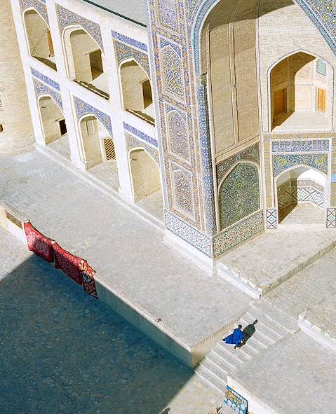 Départ en train pour Boukhara – de jour cette fois. Quatre heures durant, les paysages défilent derrière la vitre : l'Ouzbékistan des terres loin, très loin, de ses cités phares. À l'arrivée, installation pour trois nuits dans une maison ancienne d'une rue ancienne. La restauration-adaptation a été réalisée avec un flair remarquable. Les motifs de caractère – architecture et décoration – sont là sans emphase. Du coup, tout a beaucoup de naturel et d’équilibre. Brique, bois : on retrouve les éléments classiques du bâti ouzbèke ; ceux de l’ornementation, comme le stuc, idem. Dans la salle à manger, le plafond peint est tout à fait joli et le cookbook national bien traité. Ce qui contribue notablement au plaisir que l’on éprouve d’être là. Les chambres sont agréables, bien équipées, confortables. Elles font écho au parti pris esthétique et à la simplicité d’ensemble. La cour-jardin est parfaite pour une fin d’après-midi relax. Et la position vous connecte au meilleur de la ville.