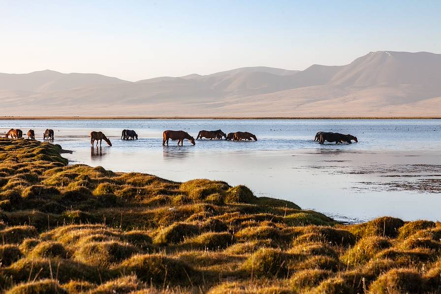 Cap sur le deuxième plus grand lac de montagne du monde : Issyk Kul. Après des paysages de montagnes minérales, il s'agit de rejoindre la vallée de Kochkor puis de longer la rive sud du plan d'eau, gratifié par de beaux panoramas.