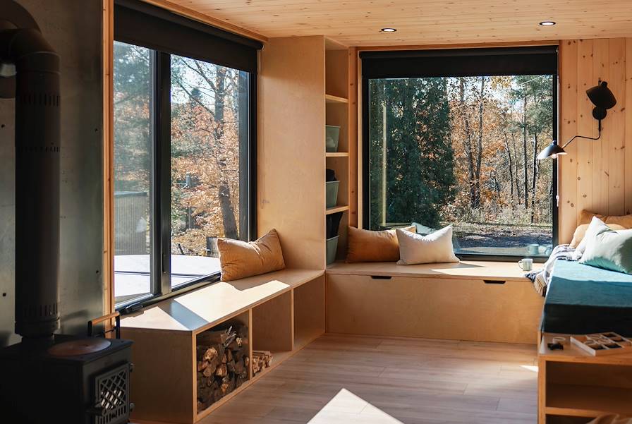 Installation pour deux nuits aux abords du parc national de la Mauricie, entre le chuchotement de la rivière et la silhouette des montagnes. Cabanes en bois, chalets, caravane Airstream (so american) : les différentes options d'hébergement ont en commun une connexion avec la nature. À l'intérieur, la décoration mêle élégance et rusticité pour créer des espaces chaleureux où l'on se sent bien. Le petit plus pour votre tribu : une intimité préservée avec seulement trois chambres sur place. Dehors, le sauna finlandais attend les plus grands. Et tous peuvent embarquer à bord des kayaks et paddles mis à disposition aux beaux jours.