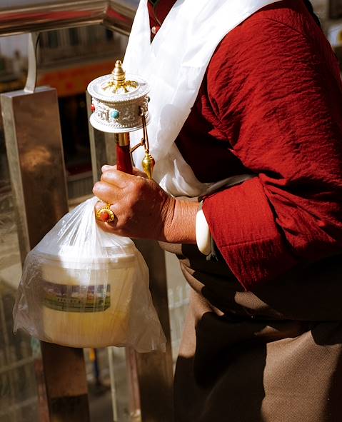 Au programme - Le monastère de Cijuelin et la vie quotidienne à Lhassa. Afin de commencer la journée dans de bonnes dispositions, cérémonie de sangsol au monastère. Il s’agit d’une offrande d’encens, à la fois purificatrice et propitiatoire. Très ancienne pratique destinée à placer sous les meilleurs auspices un laps de temps nouveau. Après cela, promenade dans les rues populeuses du centre de Lhassa jusqu’au Barkhor, autour du Jokhang. On visite le Tromzikhang, où se vendent beurre de yak, fromage, nouilles ou sucreries. Dans les marchés, on se coudoie naturellement et ce sont d’excellents endroits pour prendre le pouls d’une ville. L’intrication du sacré et du profane surprend les voyageurs arrivant de contrées où ces domaines sont soigneusement distingués. On médite là-dessus dans une maison de thé traditionnelle, devant une infusion beurrée et salée. Puis, on prend la direction du musée du tsatsa. Il s’agit de tablettes d’argile moulées à motif religieux. Des éléments – pierres ou métaux précieux, voire cendres-reliques – peuvent être incorporés à la terre, qui rendent l’objet inestimable. Les tsatsa sont autant des œuvres d’art que des objets de dévotion. La visite comprend une initiation technique.
