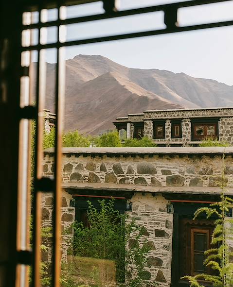 Vous profitez bien entendu des agréments de l’hôtel, mais aussi de ce paysage dont le charme king size ne s’épuise pas. Aux alentours, les champs d’orge du Tibet, soigneusement entretenus. Une jolie campagne, presque anglaise en ses verts et ses haies, qui ajoute une note d’équilibre humain au grand spectacle géologique. Cette agriculture est un aspect rarement évoqué ; il est pourtant essentiel. Hordeum vulgare trifurcatum est un élément-clé de la civilisation tibétaine. La tsampa, l’aliment traditionnel n° 1, en est faite. Ce n’est donc pas rien que ces champs. Ni ces vergers d’ailleurs, dont la variété des fruits étonne. Le Tibet champêtre est l’un des moins attendus, il n’en est que plus indispensable au voyage.