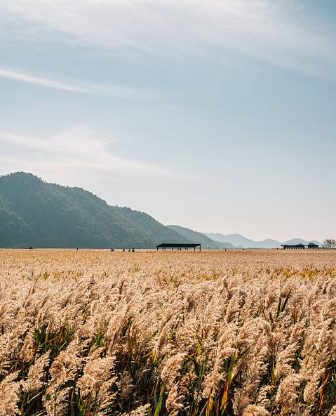En poche - Vos entrées pour la baie de Suncheon. À 40 minutes de route de Yeosu, cette aire protégée de 22 km² constitue une zone humide d’exception. Pas moins de 140 espèces d’oiseaux y migrent chaque année. Un pont en bois symbolise le passage vers cet autre monde où s’étend le plus grand champ de roseaux de Corée du Sud. Hérons et cigognes se fondent dans les branchages. L’ascension jusqu’au Mont Yongsan est récompensée par un paysage vertigineux. Le cours d’eau serpente jusqu’à se jeter dans la mer, en contrebas.