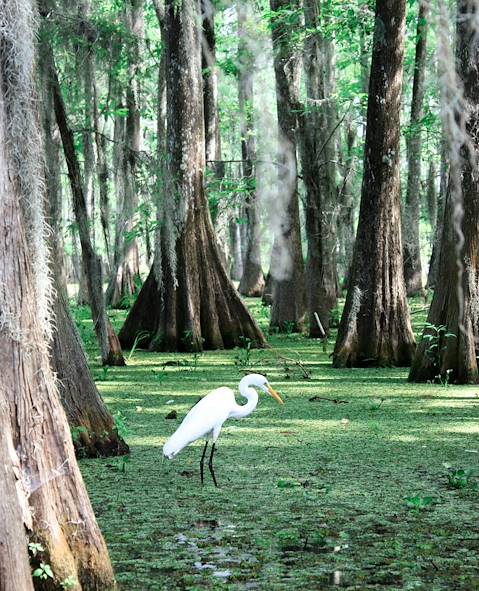 Également au programme - Navigation dans le bayou d’Atchafalaya. Le bassin est l'un des écosystèmes les plus importants des États-Unis, riche d’une grande variété de faune et de flore. Avec ses cyprès à l'aspect fantomatique tapissés de mousse, le paysage prend des airs de monde perdu. À bord de l'hydroglisseur, encadré par un guide, on flotte sur les eaux tranquilles et sombres fréquentées par serpents et alligators.