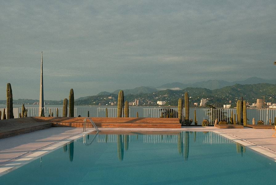 Route pour Koutaïssi. Nuit dans un immeuble XIXe du centre. Aménagement et décoration jouent des éléments anciens pour créer une atmosphère à la fois familière, rassurante et décalée. Parquets, papiers peints, tissus imprimés, mobilier vintage revisité composent un intérieur plein de charme. Dans sa chambre, on se sent immédiatement chez soi. Les parties communes sont du même tonneau et illustrent l’histoire littéraire et artistique de Koutaïssi. Cuisines modernes de Mingrélie et d’Iméréthie sont à la carte du restaurant. Et une piscine invite à barboter aux beaux jours.