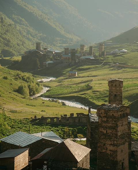 Au programme - En Haute-Svanétie. Les maisons-tours en pierre des Svanes, le peuple géorgien éponyme de la Svanétie, sont un motif saillant du paysage. D’origine médiévale, elles ont valu à la Haute-Svanétie son inscription au patrimoine mondial de l’Unesco. Il y en a plusieurs à Mestia-même. Avec votre chauffeur, vous allez à travers une spectaculaire contrée de montagne – neiges éternelles au-dessus de 3000 mètres – et de forêt – épicéa, sapin, hêtre, charme, etc. – jusqu’aux villages de la localité d’Ouchgouli, l’un des plus hauts habitats permanents d’Europe, 2100 mètres, au pied de la muraille de Bezengui. L’isolement a servi de conservateur patrimonial et les tours se dressent là sans concessions inutiles à la modernité. En 1929, Mikhaïl Kalatozov (ou, de son nom géorgien, Mikhaïl Kalatozichvili), futur réalisateur de Quand passent les cigognes, a filmé ici un documentaire pionnier d’une époustouflante beauté : Le sel de Svanétie.