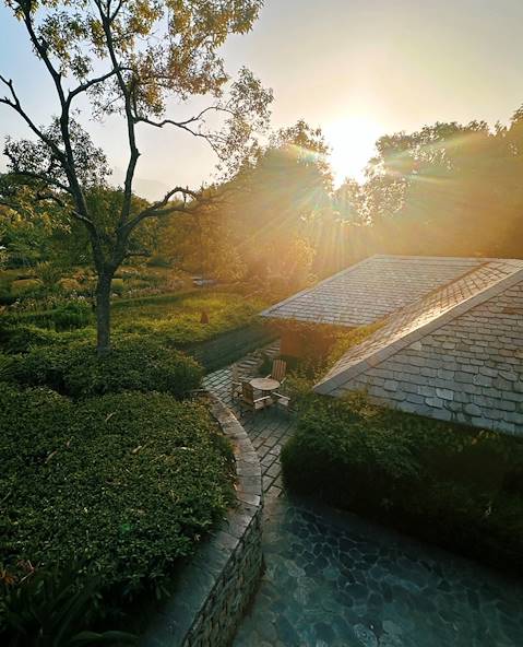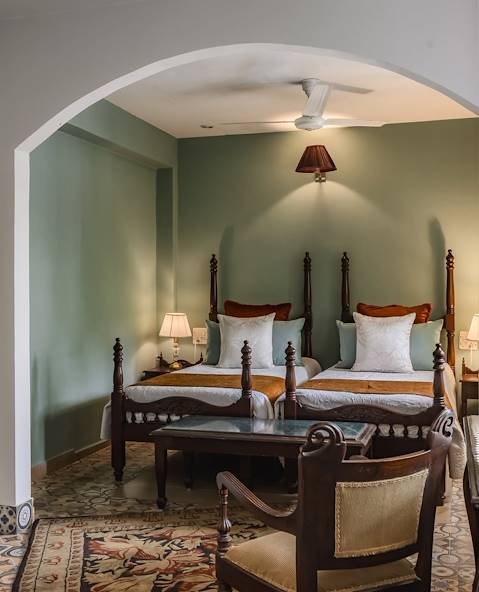 Route pour Haridwar et installation pour trois nuits dans le quartier de Khankal. L’ambiance invite à la méditation dans cette jolie bâtisse Art déco posée sur la berge du Gange. Les chambres, spacieuses et aérées, sont habillées de tons pastel. La décoration éclectique mêle des pièces anciennes remises au goût du jour et de nouveaux meubles faits à la main. Quant aux espaces communs, ils se distinguent par un carrelage bicolore, des chaises en rotin et en cannage, ainsi que des fauteuils cosy aux tissus rétro. Puisqu’on se trouve au bord du Gange, la lumière est particulièrement belle et l’on se laisse aisément aller à la rêverie, que ce soit dans le bain bouillonnant du toit-terrasse, dans le jardin planté d’arbres fruitiers ou sur la table de massage orientée face au fleuve.