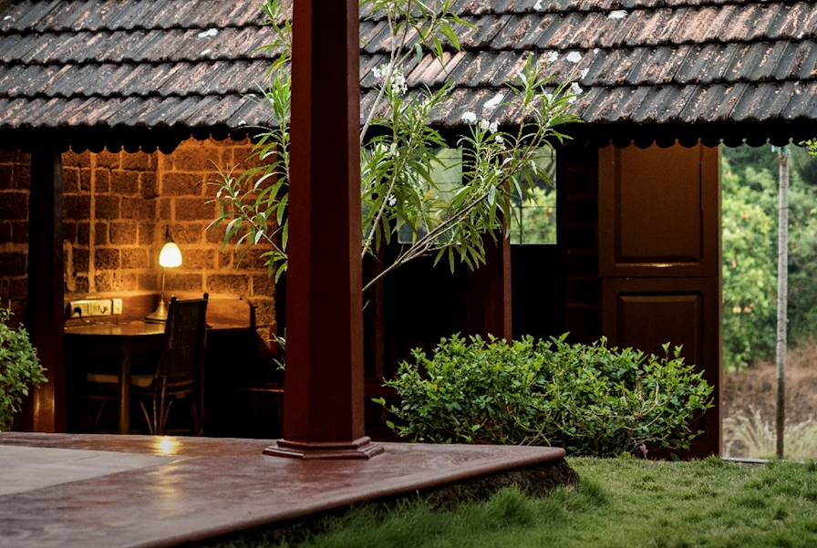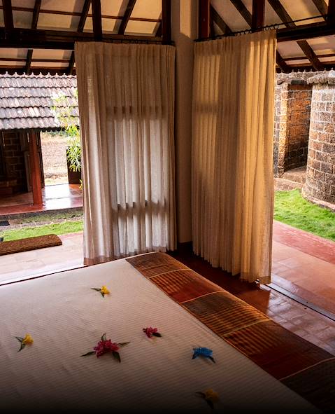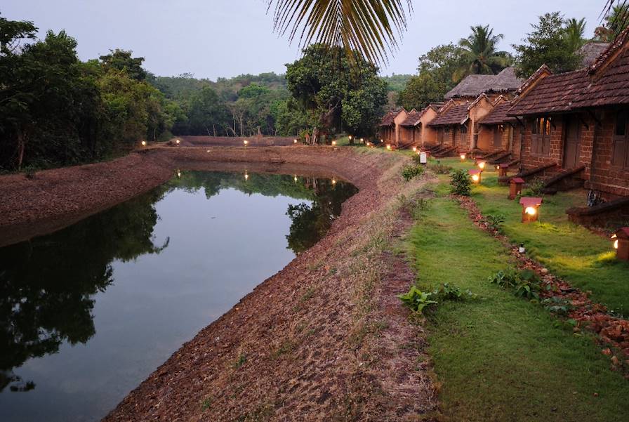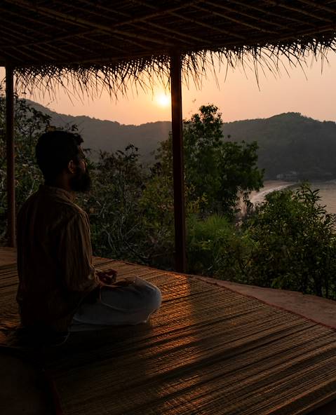 Transfert pour Gokarna en véhicule privé avec chauffeur. Trois heures durant, le véhicule s'aventure le long de la côte, flirtant avec le littoral et ses plages. En chemin, quelques langues de sable et temples hindous forment des haltes relaxantes et confirment la primauté de l'Inde du Sud sur ces deux plans. À destination, installation pour cinq nuits sur les rives de la mer d'Arabie, en surplomb d'une très jolie plage paisible. Blottie au cœur d'une dizaine d'hectares de végétation, votre adresse ambitionne d'apaiser corps et esprit. Alignés dans cet univers contemplatif, vingt-quatre bungalows bâtis dans le style traditionnel konkani reçoivent les hôtes dans des intérieurs épurés, tirant joliment des matières naturelles. La chambre, calme, est prolongée d'une salle de bain en partie ouverte. Chaque jour, vous composez votre programme tourné vers le ressourcement : méditation, ayurvéda, naturopathie, massages, yoga...