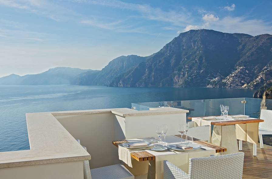 À l'issue de cette parenthèse à Salerne, prise en main du véhicule de location puis route pour Praiano, où l'on s'installe pour trois nuits. Établi sur la pente rocheuse, l’hôtel dévoile un extraordinaire panorama marin. "Contemporain" n’est pas ici un vain mot : lignes pures, blanc général, sur lequel les éléments de décoration, comme les statuettes en verre soufflé, éclatent de couleurs. Les chambres font écho : immaculées, d’un confort net et parfaitement équipées. Au restaurant, aménagé sur la terrasse supérieure, on ne sait ce qu’il faut le plus admirer, le golfe de Salerne ou la cuisine de précision du chef. Piscine extérieure, bassin intérieur, salle de gym, spa, pilates, yoga, le bien-être et l’équilibre des hôtes constituent des aspects essentiels du service de la maison.