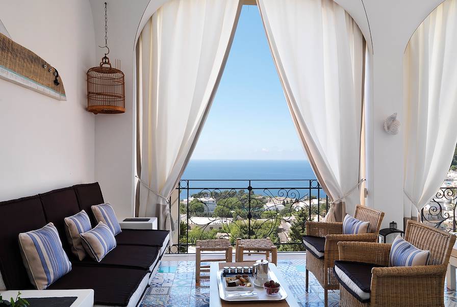 Installation pour deux nuits à quelques enjambées de la petite place centrale de Capri City. Le grand édifice XIXe a été adapté avec goût aux impératifs de l’hôtellerie moderne ; il est décoré dans un esprit sud sur mesure qui prolonge l’atmosphère de la ville. Les terrasses donnent sur le bleu étourdissant de la mer et du ciel. Il se dégage de la chambre vue mer une atmosphère agréable, une jolie déclinaison de beaux volumes, de couleurs franches et d’objets sympas. Dans la salle de bains, du marbre. Le restaurant sert une cuisine dont les ingrédients bruts sont la raison d’être. Ceux-ci, très soigneusement sélectionnés et de saison, commandent donc aux fourneaux. L’inspiration fait le reste. Dans la ronde des plaisirs s'inscrivent aussi le spa, qui regarde vers l’Orient, et une splendide piscine intérieure/extérieure. Le service très pro est aussi très aimable.