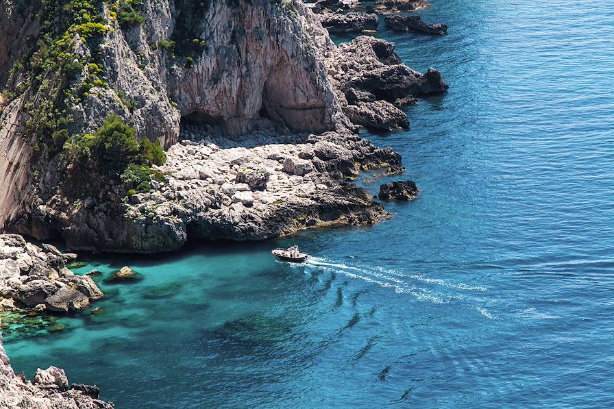 Transfert à Capri en voiture et en hydroglisseur. "Je lui ai dit Je vous aime, c’était au pays de Capri ; voilà comment, au milieu d’un beau rêve, un souvenir peut durer bien des jours…". Et voilà comment Tino Rossi précédait Hervé Vilard à propos de cette île calcaire de la baie de Naples, au large de Sorrente. Depuis toujours, les célébrités en tous genres y ont pris l’air du large.