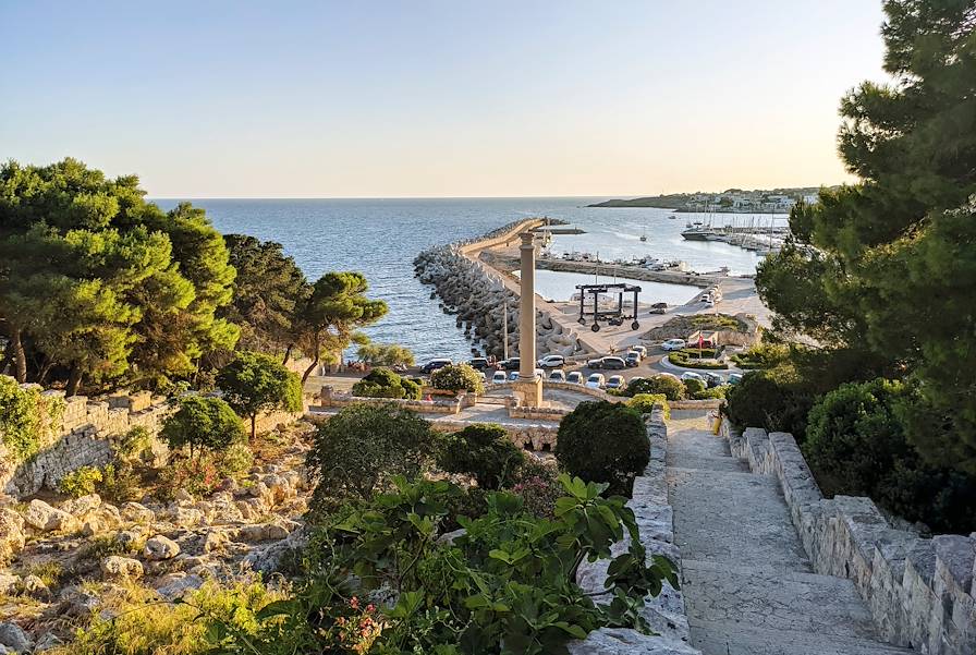 À voir - Santa Maria di Leuca, le bout du monde. C'est le point le plus au sud du talon de la Botte, à la rencontre de l'Adriatique et de la mer Ionienne. Les Romains l'appelaient "de finibus terrae" ("au bout du monde") et y célébraient le culte de Minerve. Le temple de l'époque a depuis été remplacé, au sommet de Punta Mèliso, par la Basilica Santuario di Santa Maria. La construction est desservie par une grande place, idéale pour profiter du spectacle. Voisin de l'édifice religieux, un imposant phare – le second plus important du pays après celui de Gênes – est posé à 47 mètres de hauteur, culminant à 102 mètres au-dessus du niveau de la mer. À l’intérieur, un escalier en colimaçon de 254 marches serpente sur lui-même ; lorsqu'il est ouvert au public, il mène les visiteurs à une impressionnante terrasse circulaire.