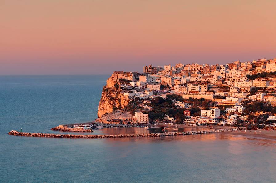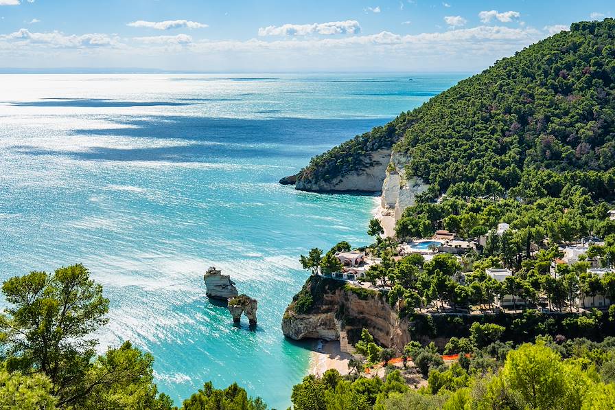 À voir, à faire - Se rendre dans le joli bourg de Vieste (30 mn de route au départ de l'hôtel) où le calcaire blanc, d’aspect crayeux, fournit toute sa beauté au site. Les falaises, veinées de minces couches de silex, les arches marines, les grottes, le fameux Pizzomunno (un pinacle de 27 mètres de haut sur la plage del Castello), les vieilles maisons : tout cela réverbère la lumière solaire à qui mieux mieux. Cathédrale, château, phare : les monuments emblématiques se caractérisent par leur élévation. On peut aussi choisir de s'éloigner un peu pour arpenter les plus belles plages du Gargano. Cernées de falaises calcaires et de pinèdes, ces dernières ne manquent ni de charme, ni d'attrait. Petite sélection de choix : Baia delle Zagare, Spiaggia di Vignanotica, Spiaggia di Pizzomunno ou encore Spiaggia di Zaiana.