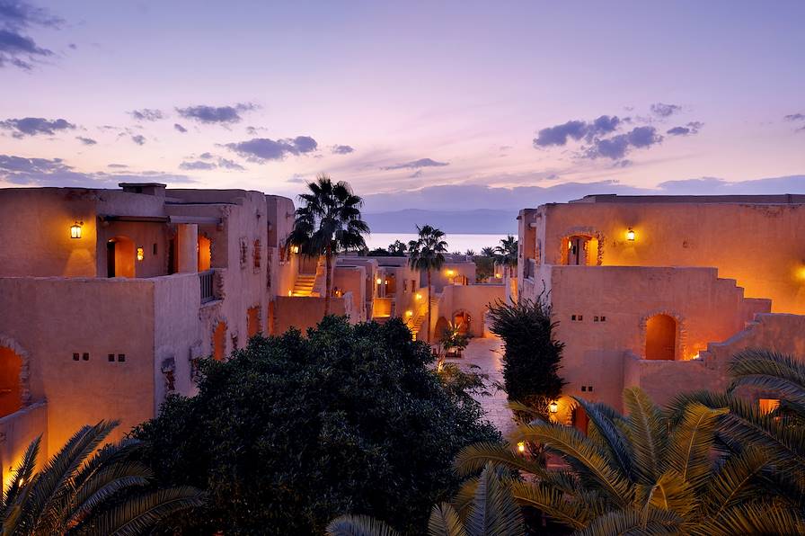 Accueil à l’aéroport puis transfert privé jusqu'à la mer Morte. Installation pour trois nuits dans un grand établissement au style international dominant bien que tempéré par des motifs orientaux stylisés. Le mot d'ordre ici semble être de vivre au soleil sans embarras. L'hôtel se prolonge au bord de l'eau par une plage privée. Des palmiers agitent doucement leurs feuilles. Les piscines – dedans et dehors – sont spacieuses et anguleuses. Les chambres, confortables et bien équipées, avec salle de bain ouverte parfois. Les multiples restaurants et bars permettent quant à eux de varier les plaisirs et les lieux.