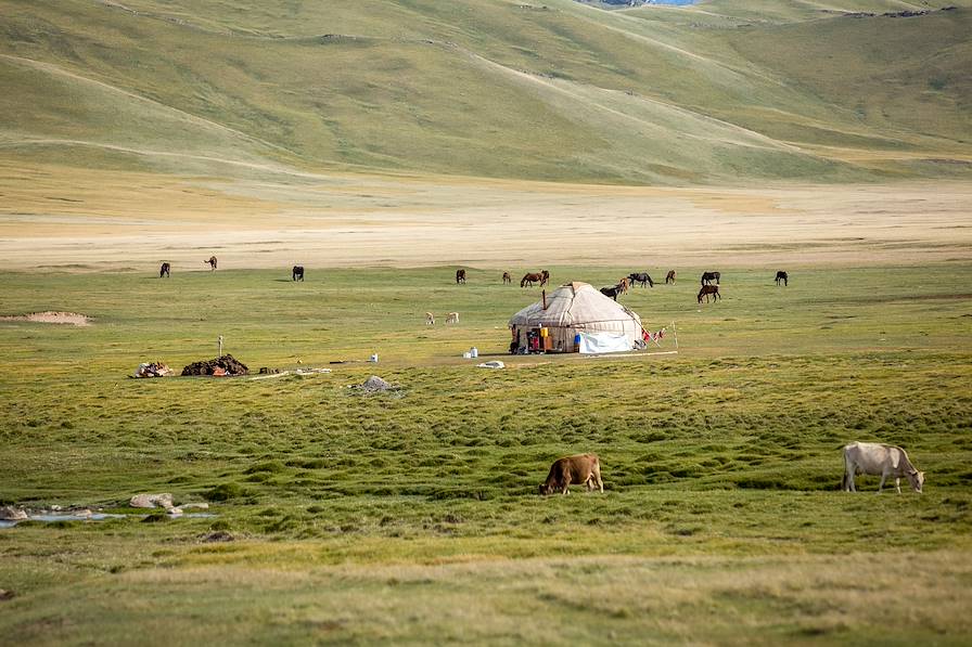 Au programme - Randonnée équestre. Les activités pastorales, toujours très importantes autour du lac, ont le cheval comme véhicule principal. Pour de nombreux Kirghizes, l’animal n’est pas un simple emblème mais un compagnon de travail fiable, frugal, efficace. Aussi ne manque-t-on pas d’à-propos en montant en selle pour explorer les rives du Son Köl, en compagnie d’un instructeur anglophone. Le paysage, ouvert, harmonieux, transporte. Les oiseaux - dont la grue cendrée, l’élégant bec-d’ibis tibétain, l’oie à tête barrée et l’aigle royal - fréquentent nombreux ces parages. Les marmottes, affairées et vigilantes, occupent les pentes. Autant de rencontres possibles sur un parcours grand air.