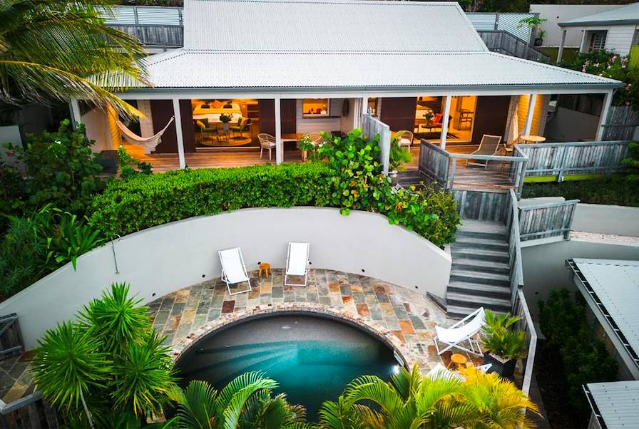 À Saint-Martin - Votre pied-à-terre ne compte que quelques chambres, préservant l'intimité de chacun. La vôtre est une suite deluxe dotée de sa propre cuisine et d'une vue imprenable sur la mer. Couleurs pimpantes, bois rouge de Guyane, matériaux nobles, béton ciré éclatant, les intérieurs sont remarquables, d’autant plus que tous les meubles ont été confectionnés sur place. De la terrasse, on surplombe la baie. Il ne reste plus qu’à se glisser dans le hamac ou dans les fauteuils en teck pour admirer le panorama. Plus tard, un kayak ou un bateau vous emmènera vers l'îlot Pinel.