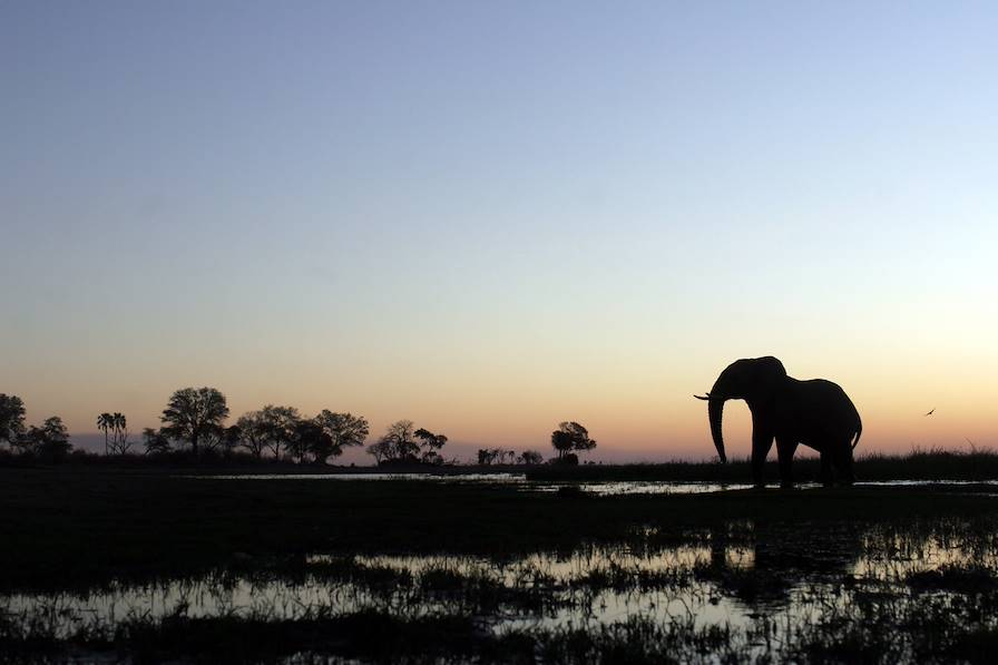 Vol en avion-taxi pour Maun, puis vol pour les infinités plates et blanches des Makgadikgadi Pans, une région peu fréquentée du Botswana. On y pose ses valises pour deux nuits dans un camp avec piscine, fondé et géré par un guide anglais émérite qui, le soir à table, raconte de passionnantes histoires de safaris. Du haut d'un éperon rocheux, le camp surplombe la rivière Boteti et le parc national des Makgadikgadi Pans. Les éléphants viennent très nombreux boire, se baigner et jouer dans l’eau, souvent à plusieurs et cela tout au long de la journée. Le spectacle est saisissant. Le camp dispose d’un observatoire en contrebas. Très pratique, il vous permet d’y observer le bain des éléphants. Viennent également le long de la rive koudous, gnous, lions et hyènes. On est aux premières loges pour assister au grand spectacle de la nature.